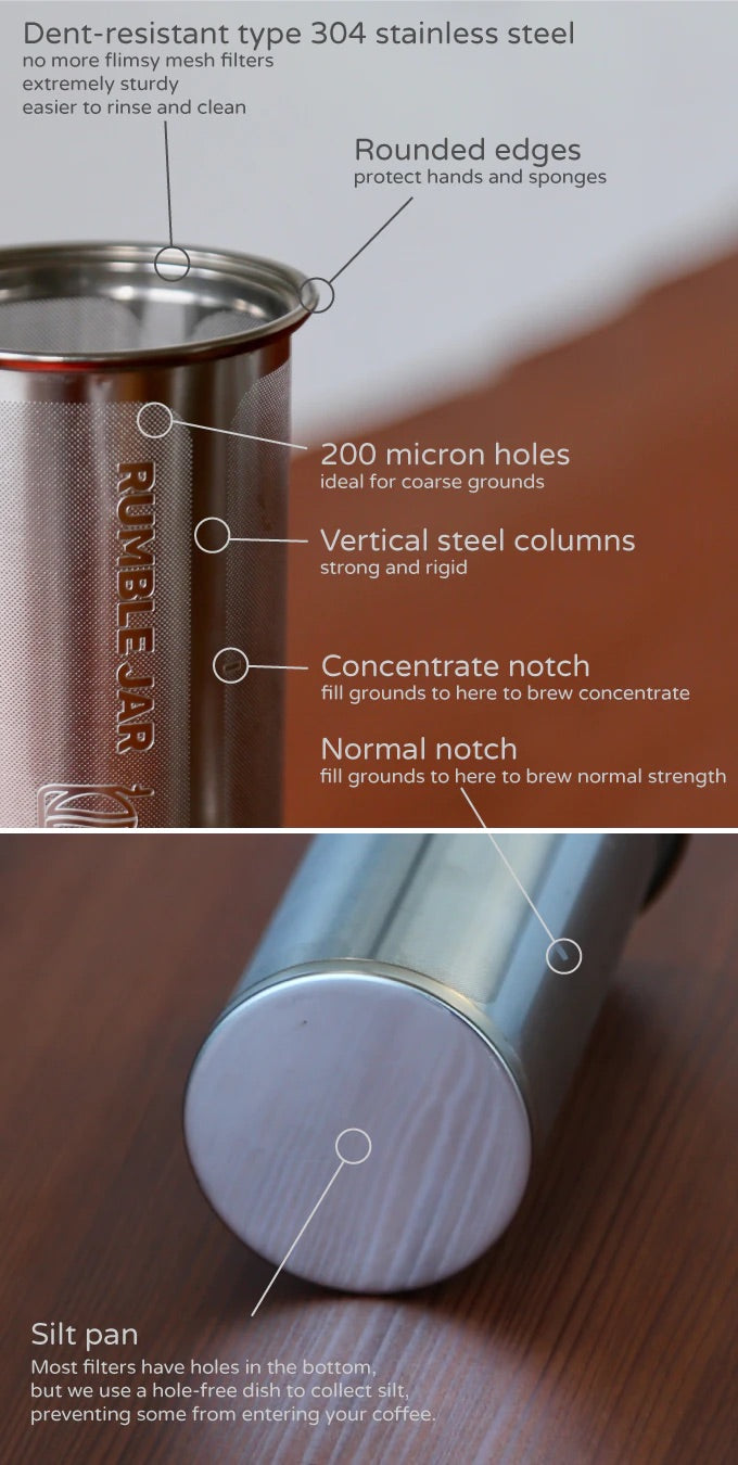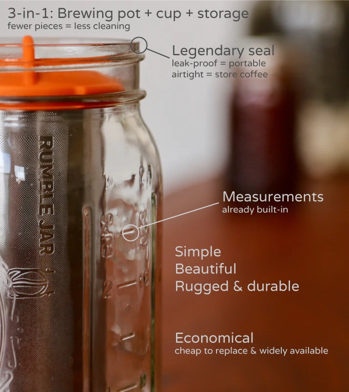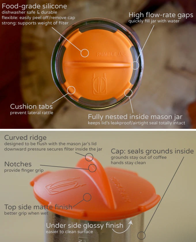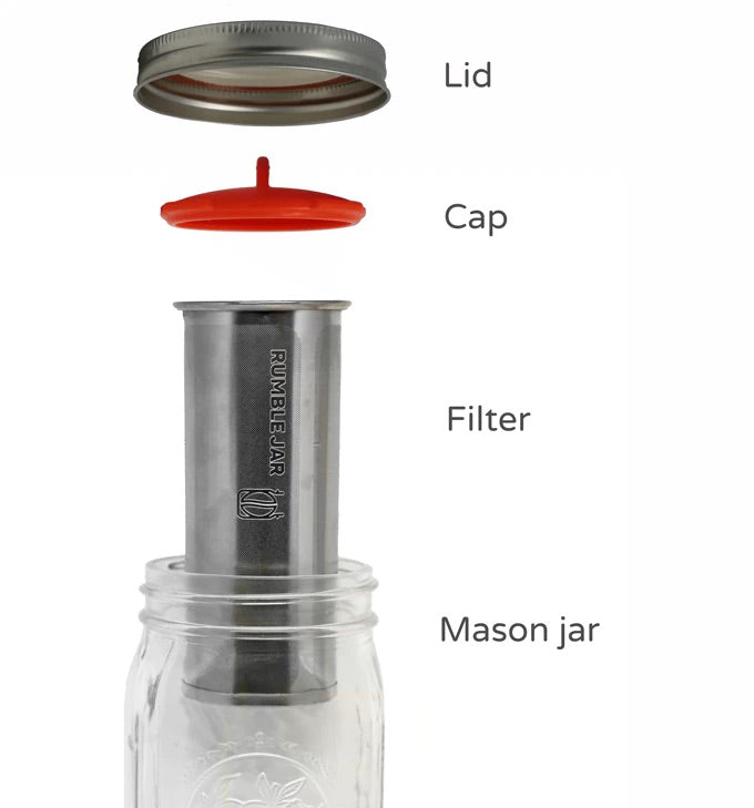 Make barista-quality cold brew coffee at home. Rumble Jar is a next-generation cold brew coffee maker, designed to work in tandem with the classic Mason jar. With this filter plus a compatible half-gallon Mason jar, you've got all the equipment you need to make cold brew coffee at home that tastes as good as the stuff you buy in stores. Just take your favorite coffee beans, grind them coarsely, add tap water and give it a rumble. Total prep time takes less than a minute, and by the morning you'll have delicious cold brew coffee ready to drink. Read more about what makes our filters so great.